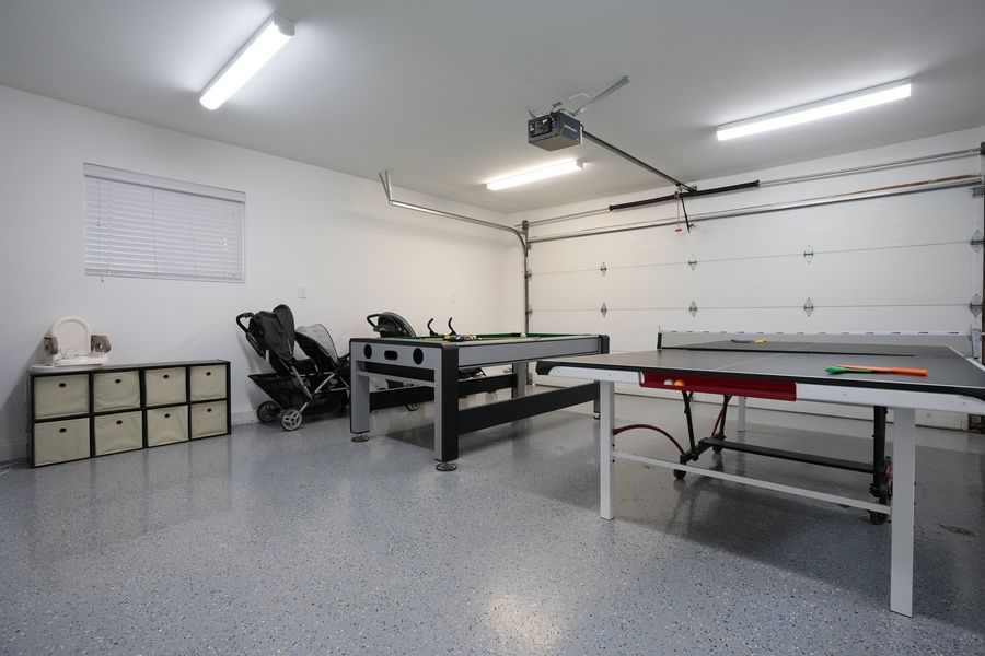 There is a pack 'n play, a single stroller, a double stroller, a highchair & booster seat for your infants and toddlers. The game room has a STIGA ping pong table and cubbies with toys and games. The family room has a 60′ TV, DVD player, and cable with Disney Channel & Time Warner's top 200+ channels. Hi-Speed wireless internet is included. Relax in our new sparkling pool and in-ground jacuzzi in the rear yard. There is also a natural gas BBQ, patio dining set, and additional chairs.
